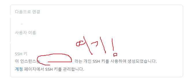 해당 인스턴스의 관리에 가보면 이 인스턴스가 어떤 ssh키로 생성되었는지 설명되어있다.