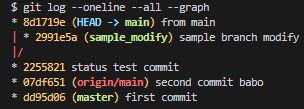 순서대로 sample_modify 라는 브랜치가 생성됐고 sample branch modify 라는 커밋이됐음