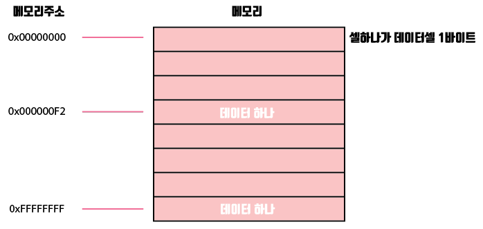 위 그림처럼 메모리 하나는 1바이트(8비트)의 크기를 가지고 있고 각 셀마다 메모리 주소가 지정되어있다.