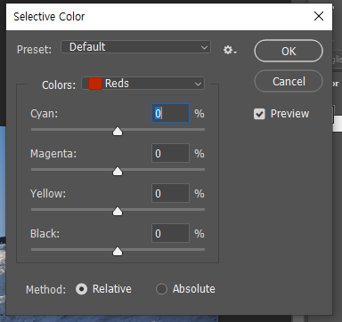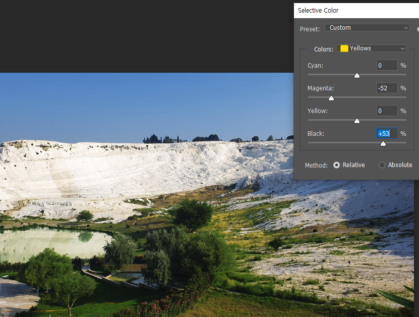 cyan에서 옐로우 낮추고 블랙높이샘