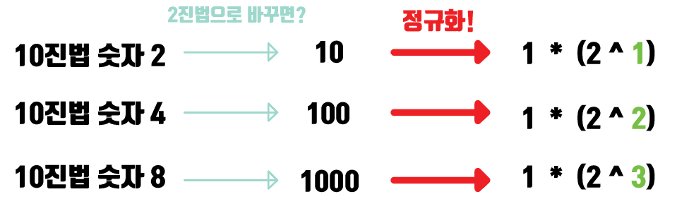 10진법 숫자를 2진법으로 바꾼후, 이 숫자를 정규화를 한다.