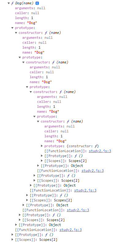 이 생성자 함수 Dog안에 프로퍼티 prototype안의 constructor프로퍼티에는 다시 생성자 함수 Dog의 함수객체가 바인딩되어있다. 때문에 저렇게 무한의 지옥으로 들어가게 된거다.