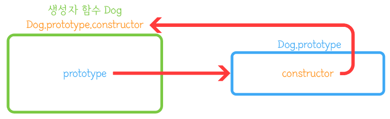 생성자 함수 Dog의 함수객체에는 prototype이라는 프로퍼티키가 식별자로써 있고 이 식별자를 참조하면 prototype객체에 바인딩이 되어있어 이 객체를 참조한다. 또 이 prototype객체안의 constructor 프로퍼티키가 식별자로써 Dog생성자 함수객체를 참조한다고 보면된다.