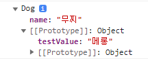 console.log(dog1.__proto__); // {testValue :"메롱"}