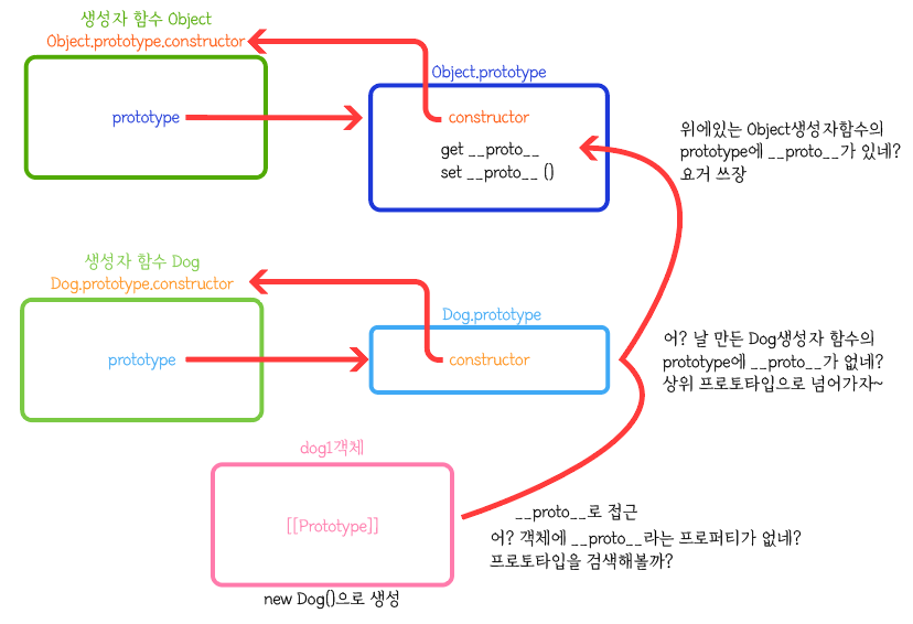 저 과정에서 Dog.prototype에서 __proto__를 검색했을때 없어서 상위 프로토타입 체인으로 넘어갔다.