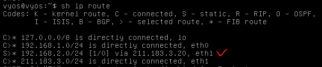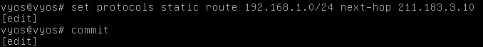 destination network는 192.168.1.0/24, 이 대역대로 가기위해선 head vyos의 eth1인 211.183.3.10아이피를 넣어주면 된다.