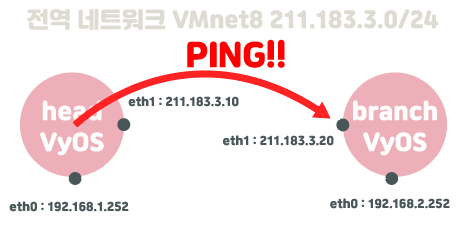 이 안내표를 보고 핑핑이가 211.183.3.20 eth1로 가게 된다면, branch vyos에 도달했기때문에 192.168.2.252로 찾아 갈 수 있게되고 192.168.2.100과 같은 대역대에 있기 때문에 핑이 도달 할 수 있다.