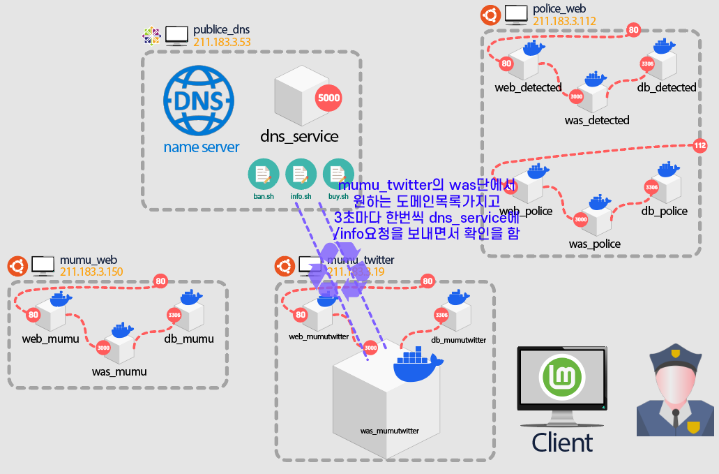 클라이언트와 경찰관이 저 컨테이너들로 배포한 웹사이트를 접속한다는 가정으로 스토리를 만들었습니다^^