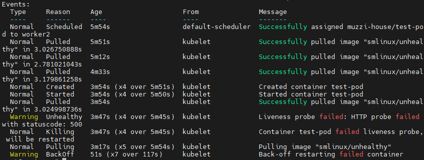 test-pod의 상태를 describe로 살펴봤을때도 sccess였다가 killing하고(500응답) 다시 pulling이미지 등 반복작업을 하게된다.