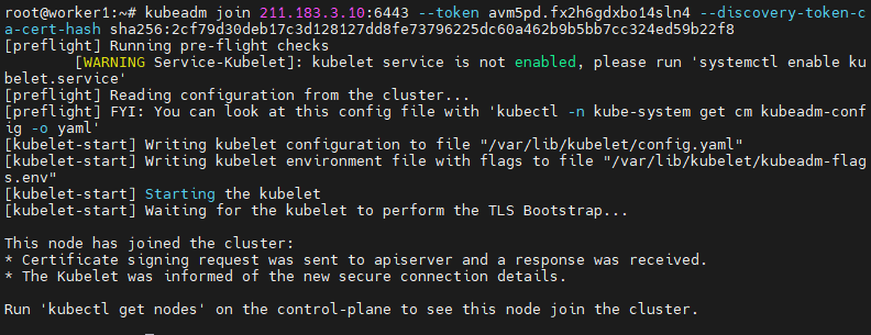 kubeadm join 211.183.3.10:6443 --token avm5pd.fx2h6gdxbo14sln4 --discovery-token-cash sha256:2cf79d30deb17c3d128127dd8fe73796225dc60a462b9b5bb7cc324ed59b22f8