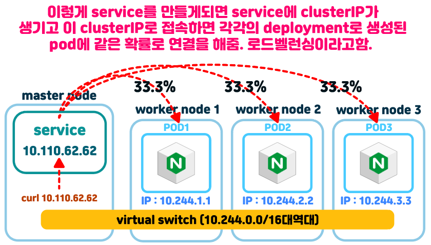 위 그림처럼 service를 만들게 되면 이 service에 cluster IP가 생기고 이 cluster IP로 접속하면 각각의 pod들에 같은확률로 균등하게 연결되는, 즉 로드벨런서 역할이 된다.