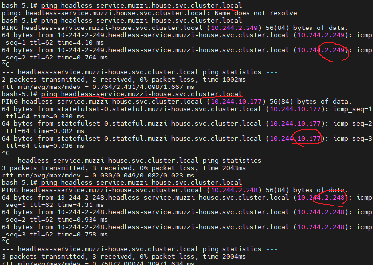 신기하게 headless-service에 대한 도메인이 세개와 각각 세개의 아이피가 나오게 된다.