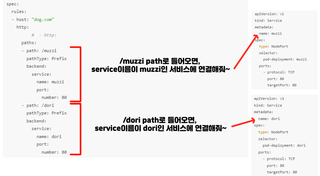 host를 정해줬는데, dog.com:인그레스포트/muzzi or dog.com:인그레스포트/dori 에 따라서 서비스를 나눠주겠다는거다.