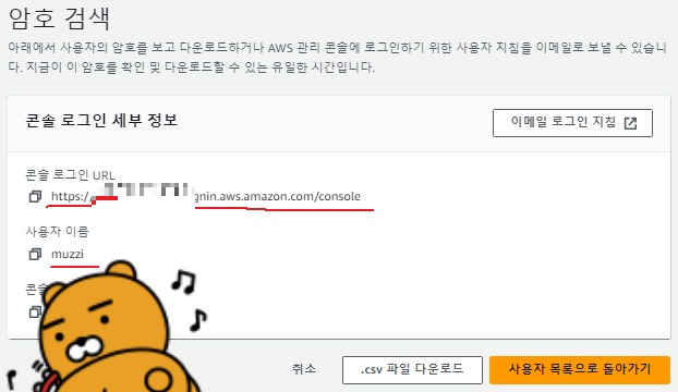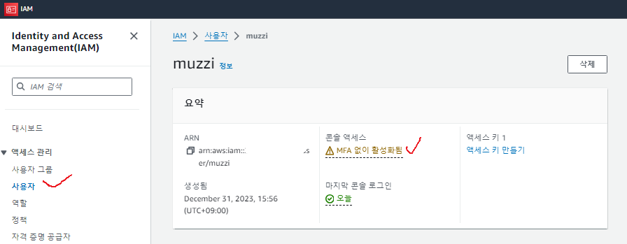 콘솔액세스에 MFA없이 활성화라고 되어있는데 안전한 로그인을 위해서 MFA설정을 해주는게 좋다.(거의 필수임.