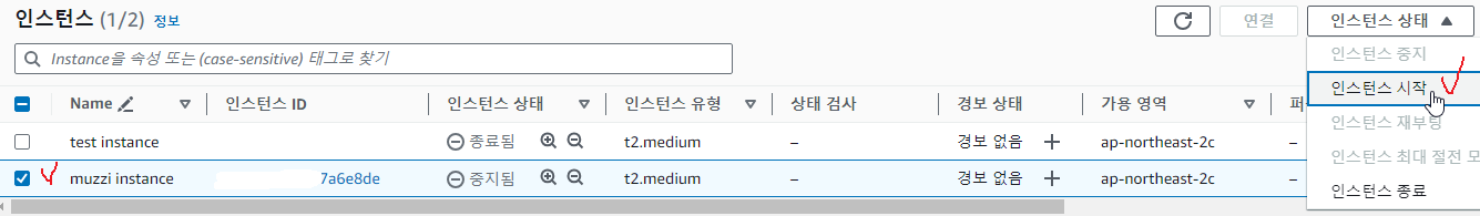 저렇게 시작해주고 인스턴스 상태가 대기중이었다가 시간이 좀 지나면 다시 인스턴스 상태가 실행중으로 바뀌고 정상작동된다.
