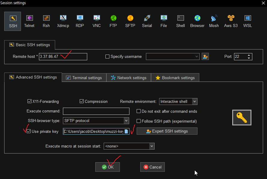 둘중 하나를 켜고 ssh 접속 프로그램을 켜주자. 난 moba x term을 사용했다.