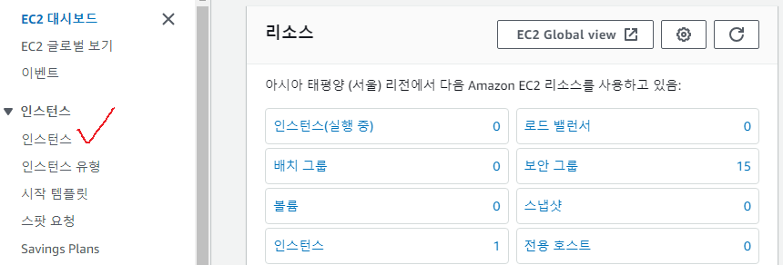 왼쪽탭에 인스턴스를 들어가자.