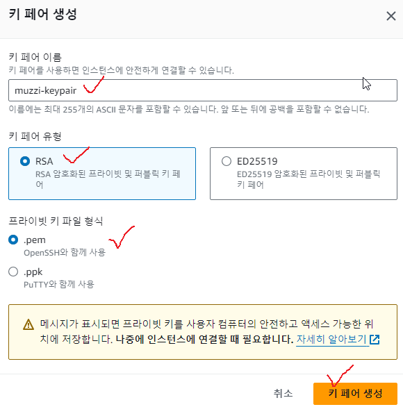 난 muzzi-keypair.pem라는 파일로 만들어줬었다. 그리고 생성해보면,