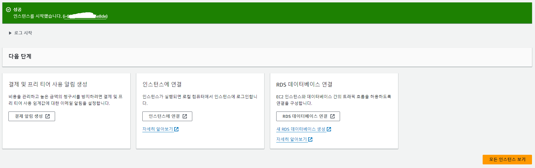 자주쓰는 프리티어알림(이전포스팅에서 함) 인스턴스연결, rds로 db연결 등등이 뜨는데 난 그냥 웹서버만 테스트할거니까 아래 '모든 인스턴스 보기' 버튼을 클릭해라.