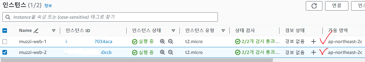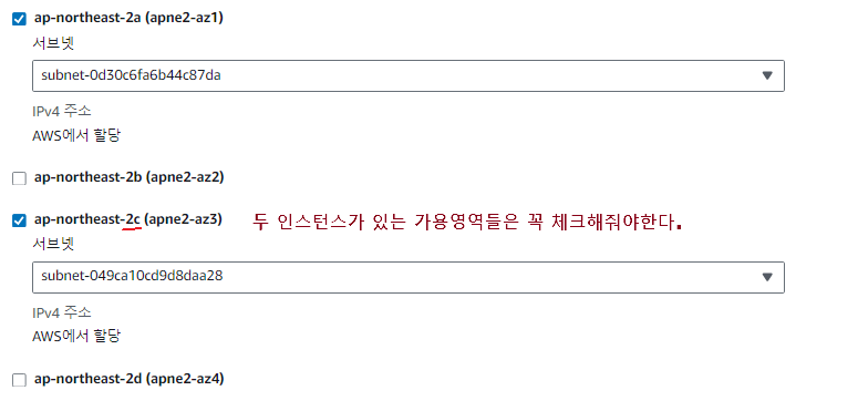 둘다 2c라는 가용영역에 만들어진 인스턴스이므로 위에 선택할 가용영역중 2c로 끝나는 영역은 필수로 해주고 두개 이상 체크해줘야하니 나머지 하나는 아무거나 선택해주면 된다.