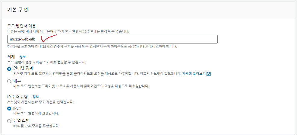 로드밸런서를 생성하는 설정을 해주는 페이지로 넘어가는데 난 이 로드밸런서 이름을 muzzi-web-alb로 만들거다.
