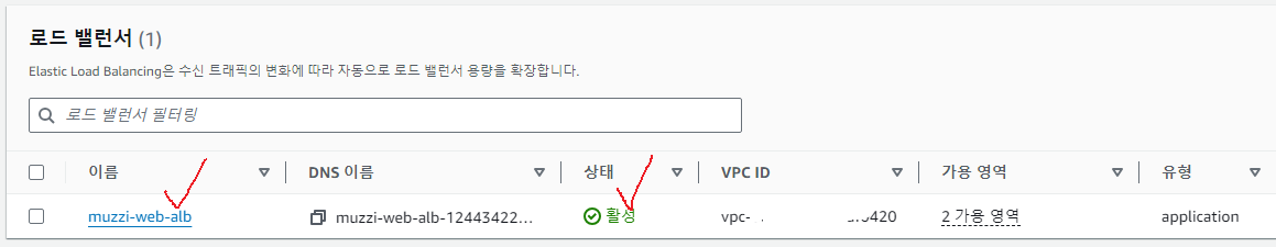 막 생성한 muzzi-web-alb가 프로비저닝 상태이다.