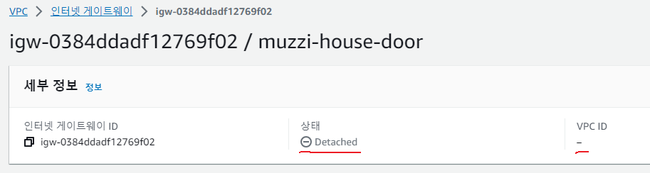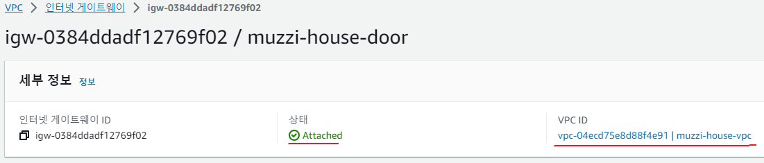 짜잔~ 이제 muzzi-house-door게이트웨이 상태가 Attached로 바뀌었고 VPC가 muzzi-house-vpc에 잘 연결되었다고 떴다.
