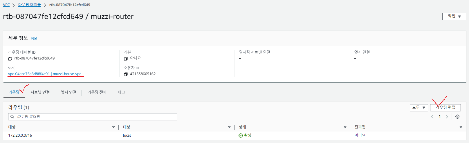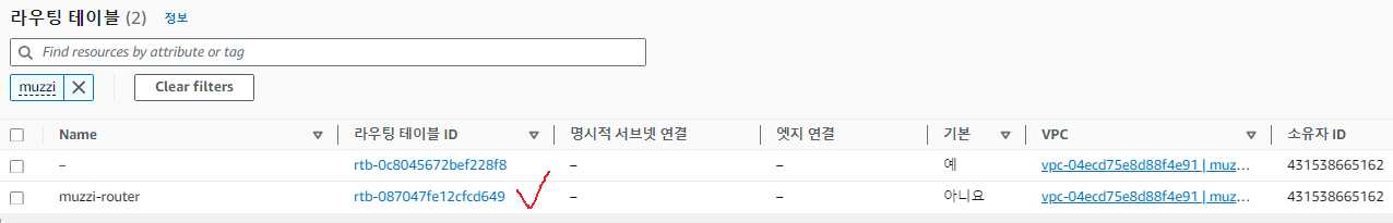 라우팅테이블이름은 아까 개념그림에서처럼 muzzi-router이라고 정해줬다. 사실 그냥 라우터같아서 걍 이렇게 이름정해줌..