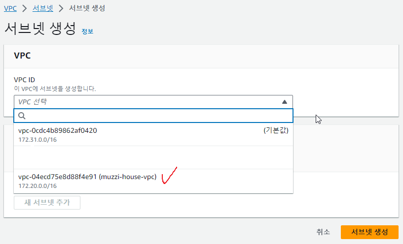 위에 만든 muzzi-house-vpc로 선택해주자.