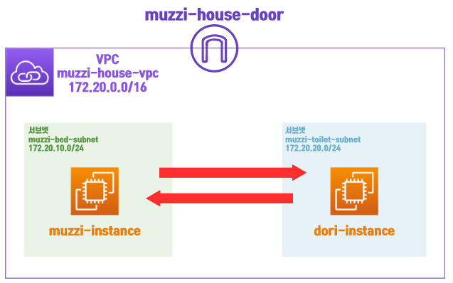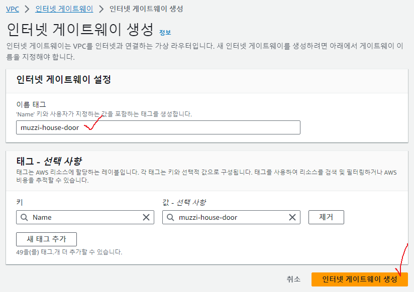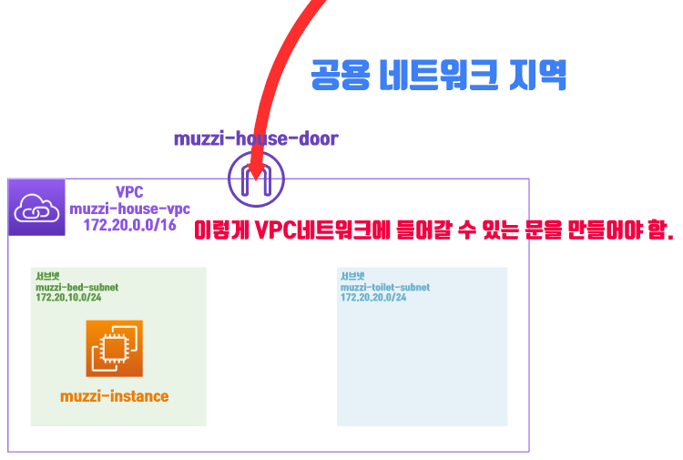 이 그림처럼 muzzi-house-vpc라는 네트워크 대역 엣지에 muzzi-house-door이라는 인터넷 게이트웨이를 먼저 뚫어줘야한다.