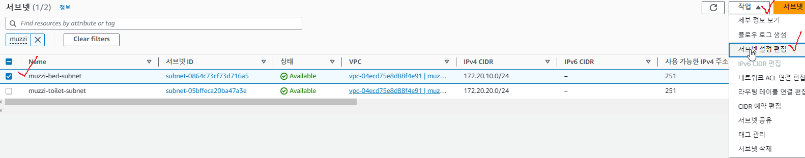 서브넷 하나 체크하고 우측 상단에 '작업'버튼을 누르고 '서브넷 설정 편집'으로 들어가주자.