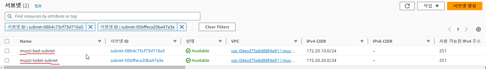 그럼 VPC콘솔 서브넷탭에서 두 서브넷이 만들어진걸 확인 할 수 있다.