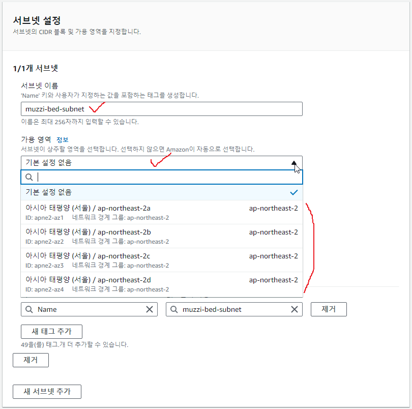 이름은 muzzi-bed-subnet으로 했고, 특이하게 가용영역을 선택할 수 있다.
