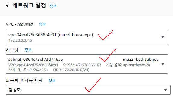 그럼 VPC등 여러가지를 선택해 줄 수 있는데, VPC는 우리가 아까 만든 muzzi-house-vpc로 선택, 서브넷은 muzzi-bed-subnet으로 선택해줬다.