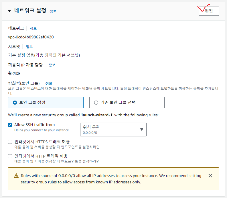 EC2인스턴스 만드는 페이지에서 네트워크 설정하는곳에서 우측 상단 '편집' 버튼을 눌러주자.