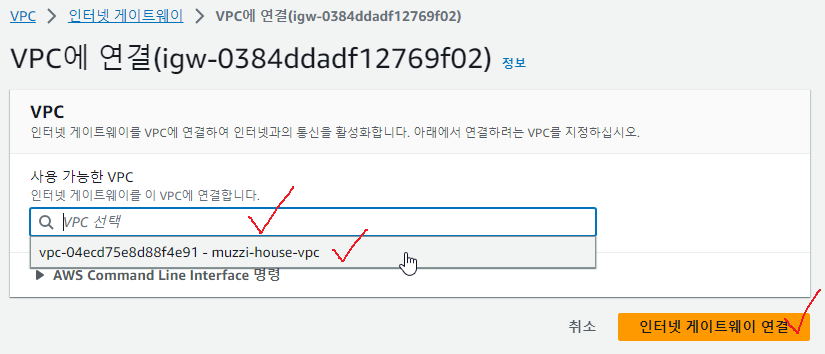 우리는 이 muzzi-house-door 인터넷 게이트웨이를 muzzi-house-vpc에 붙여주고 싶으므로 설정해주고 '인터넷 게이트웨이 연결'버튼을 눌러주자.