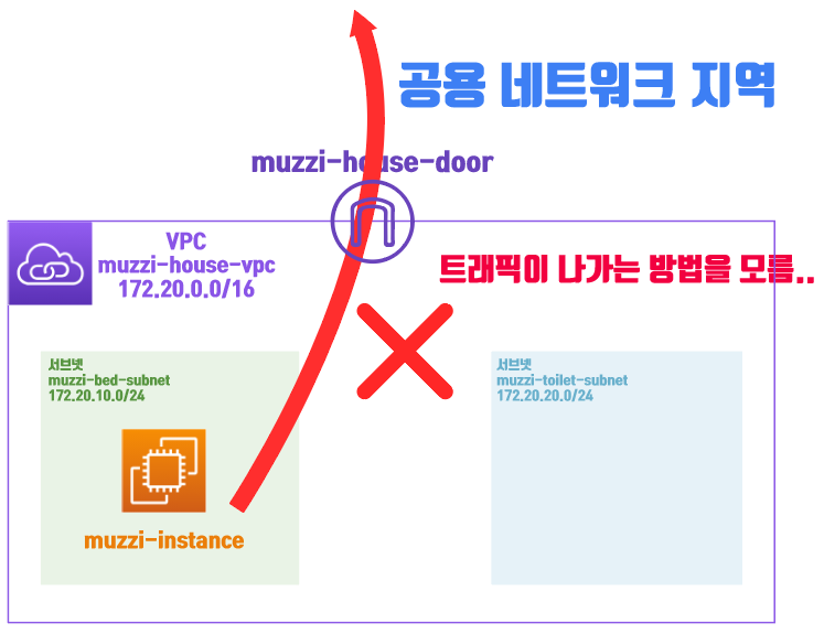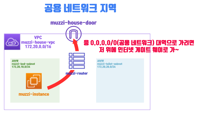 이 그림처럼 muzzi-house-vpc라는 네트워크 대역 엣지에 muzzi-house-door이라는 인터넷 게이트웨이를 먼저 뚫어줘야한다.