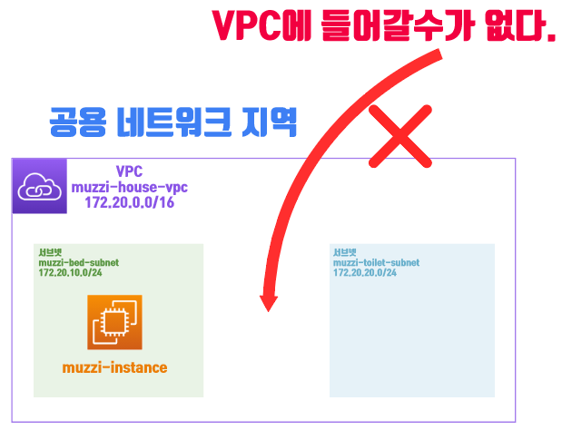 우리가 현재 muzzi-bed-subnet에 만들어진 ec2인스턴스에 접속하려는건 ssh 접속이고 네트워크가 분리되었으니 안되는게 당연한거다.