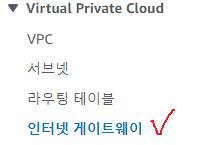 VPC콘솔에서 좌측에서 '인터넷 게이트웨이' 탭으로 들어가자.