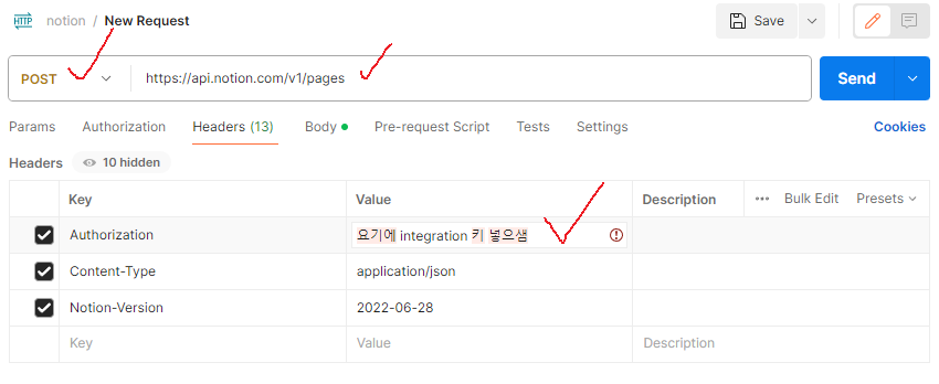 저 Authorization키에는 값으로 아까 통합integration만들때 나온 키 복붙해서 넣으면 됨