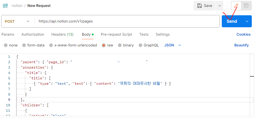 이제 body쪽에서 보낼 JSON형식 데이터를 적을건데, 저기 parent 부분에 페이지 링크따서 페이지 아이디 따온거 넣으샘