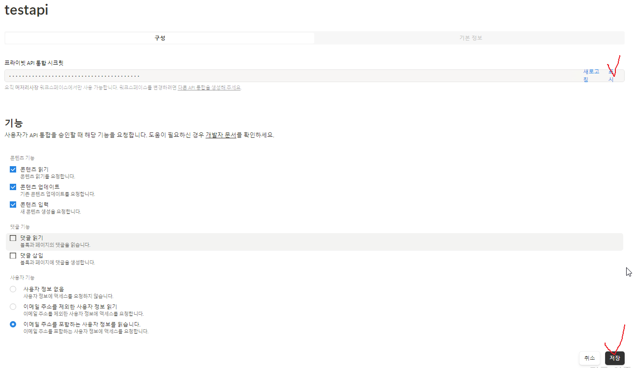 그다음 구성창으로 넘어가는데, 저기 '프라이빗 API 통합 시크릿'이 중요하다.