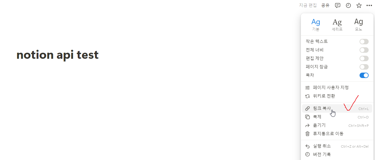 간단히 테스트용 notion api test라는 페이지를 만들었음.