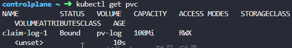 지금 있는 pv중에 제일 적절한거 쓴건데 용량만 100Mi짜리 하나있으니 저걸 갖다 쓴거임