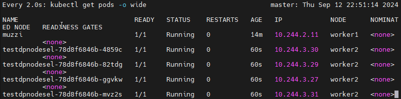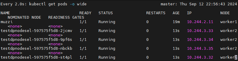 whos=muzzi라는 라벨링되어있는 worker1노드에만 deployment pods가 생성된걸 볼 수 있음