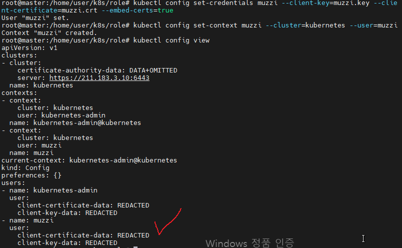 kubectl config set-credentials muzzi --client-key=muzzi.key --client-certificate=muzzi.crt --embed-certs=true