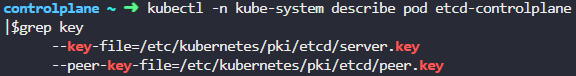 kubectl -n kube-system describe pod etcd-controlplane |$grep key