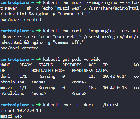 kubectl run dori --image=nginx --restart=Never -- sh -c 'echo "dori web" > /usr/share/nginx/html/index.html && nginx -g "daemon off;"'