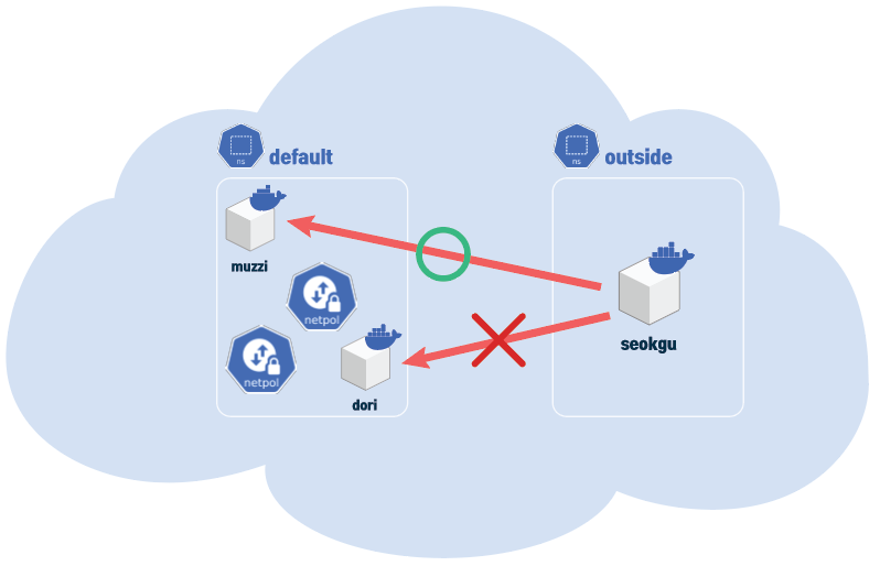 outside ns 의 seokgu에선 muzzi pod와 통신이 안되지만, 같은 default ns의 dori pod에서는 통신이 된다.