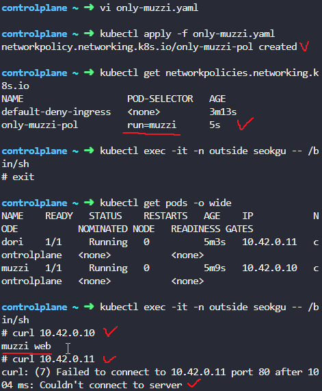 해당 network policy를 만들어주고 seokgu pod에서 muzzi dori pod에 각각 curl 요청을 날려보니 muzzi는 되고 dori는 안된다.